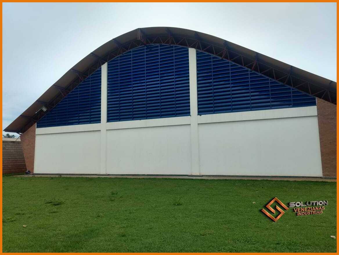 veneziana industrial Fachada em pintura eletrostática azul Del Rey aplicada em um ginásio poliesportivo tem como finalidade apresentar uma das possibilidades de aplicação do produto em um ambiente esportivo. A cor azul Del Rey utilizada na pintura eletrostática transmite elegância e modernidade, além de harmonizar com a maioria dos projetos arquitetônicos.A veneziana industrial Solution em pintura eletrostática azul Del Rey é ideal para o uso em ginásios poliesportivos, já que oferece uma ventilação natural adequada e uma iluminação natural que pode ser ajustada de acordo com as necessidades do espaço. A imagem exemplifica como o produto atua tanto em propriedades funcionais, contribuindo com a climatização e iluminação natural, como também em propriedades estéticas, trazendo harmonia e beleza ao ambiente do ginásio poliesportivo. Em resumo, a imagem mostra a veneziana industrial Solution em pintura eletrostática azul Del Rey como uma solução eficiente, prática e moderna para quem busca aliar conforto térmico, economia de energia elétrica e design sofisticado em ginásios e espaços poliesportivos.